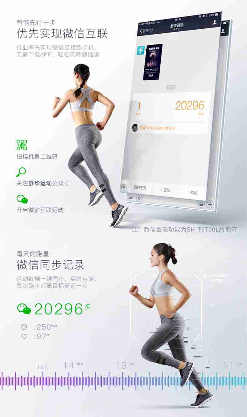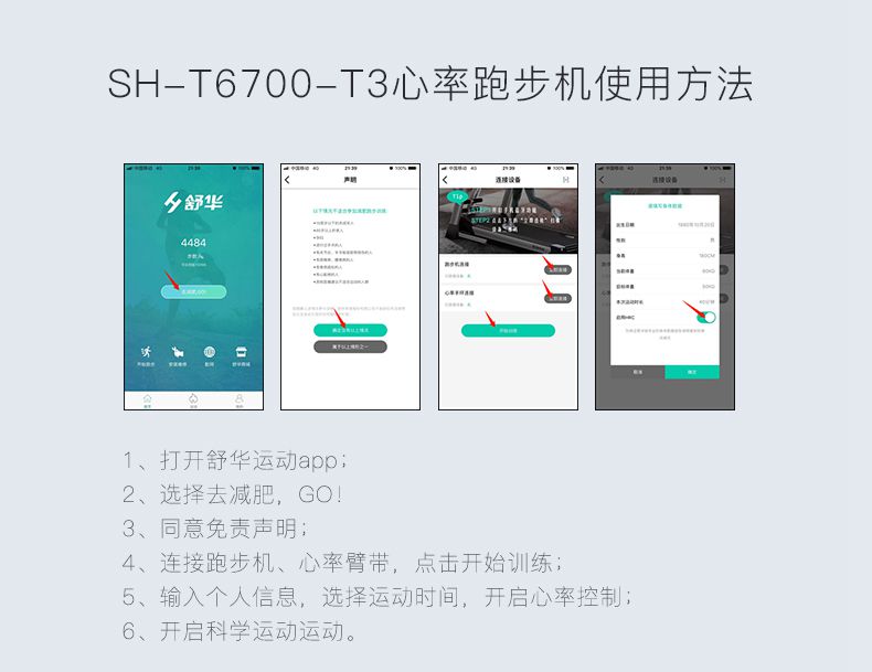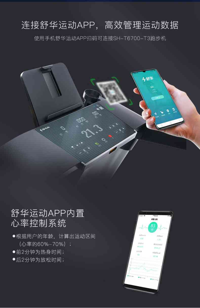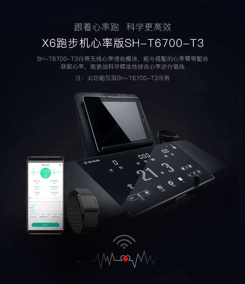 SH-T6700-T3跑步机为了帮助用户进行更加科学有效的运动,搭载好博体育APP连接心率臂带实现心率控制,通过监测运动心率从而实现科学运动。