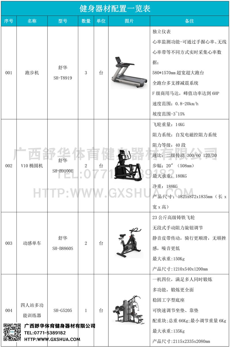 1.好博体育V9跑步机SH-T8919*3台-独立仪表-简洁大气,全新外观设计,健康运动新选择;心率监测功能,可通过手握心率、无线心率带等不同方式实时采集心率数据;580*1570mm超宽超大跑台-跑感舒适,跑台整体安全稳定;全跑台多支撑减震平台,保证跑台超强支撑力,达到180kg支撑,满足专业健身房需求。F级商用马达-超强马达,AC 3.0HP 交流,峰值功率达到6HP,F级商用品质。速度范围达到0.8-20km/h;V9跑步机可实现跑台扬升功能,坡度范围-3~15%,满足不同的锻炼需求。