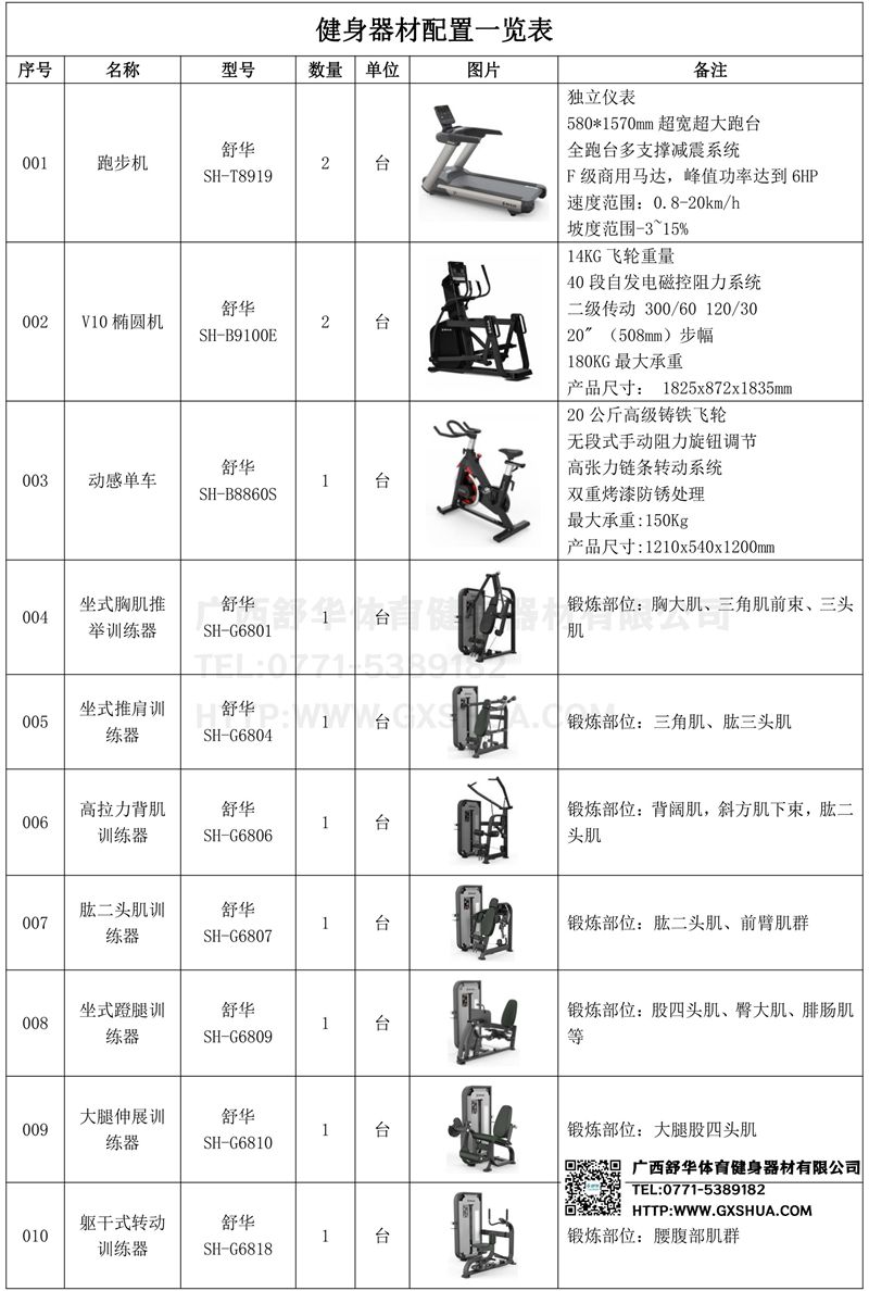 1.好博体育V9高端跑步机SH-T8919*2台-独立仪表-简洁大气,全新外观设计,健康运动新选择;心率监测功能,可通过手握心率、无线心率带等不同方式实时采集心率数据;580*1570mm超宽超大跑台-跑感舒适,跑台整体安全稳定;全跑台多支撑减震平台,保证跑台超强支撑力,达到180kg支撑,满足专业健身房需求。F级商用马达-超强马达,AC 3.0HP 交流,峰值功率达到6HP,F级商用品质。速度范围达到0.8-20km/h;V9跑步机可实现跑台扬升功能,坡度范围-3~15%,满足客户不同的锻炼需求。