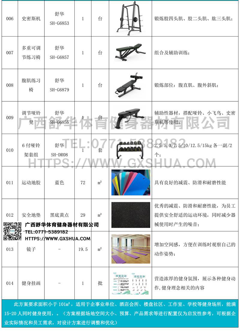 此方案要求面积小于101m²,适用于企事业单位、酒店会所、楼盘社区、工作室、学校等健身场所,能满15-20人同时健身使用。(方案根据场地空间大小、预算、产品需求等进行配置仅为启发性参考,可根据企业实际情况和员工需求,对设计方案进行调整和优化)