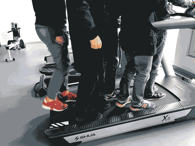 发现这台跑步机竟然根本无视于我们的体重,载着五个人毫无违和感(看上图)。 所以,你的体重如果超过200斤,在使用这台机器时,也可以放心蹦跶。