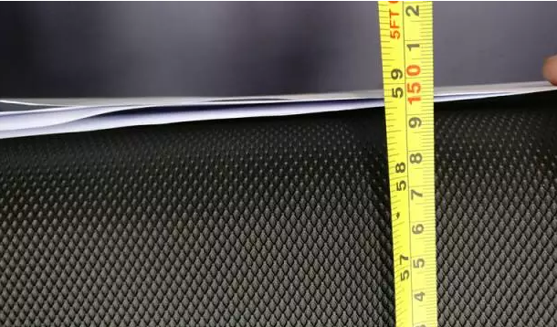实测跑带的厚度为2.25mm,即便用美工刀不断割滑,也毫无划痕,说明好博体育这款跑步机跑带还是相对比较坚固度的,不会很容易断裂和磨平。